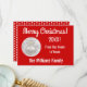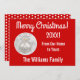Elegant Christmas Card with red background, a beautiful illustration of a silver ornament highlighed in a white circle. Classic white font with complete information, all of which can be changed in the editable areas. Back has white polka dots on contrasting red background to match the front colour.