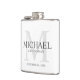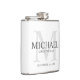 This flask features personalised groomsman's name with title and wedding date in grey and monogram in light grey as background, in classic serif font style, on white background.