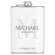 This flask features personalised groomsman's name with title and wedding date in grey and monogram in light grey as background, in classic serif font style, on white background.