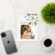 Make a memorable statement this holiday season with this chic design featuring photo template, white poinsettia, pine cone, fir branches, greenery and line-drawn gold foil leaves and berries with editable text fields. Back features complementary floral graphic and additional text field.