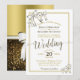 This beautiful wedding invitation features lacy script calligraphy on a white background with clusters of white ribbons and gold trim. The back has white & gold ribbons and bows separating a gold gradient or ombre on the top from shimmering gold bokeh sparkles on the bottom. This gorgeous and fancy invitation is at once formal and casual. All text is customizable.