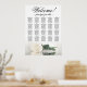 Elevate the ambiance of your wedding reception with this exquisite seating chart, boasting a captivating and refined aesthetic. Featuring a magnificent design with a solitary long-stemmed ivory, white, or cream coloured rose positioned horizontally, delicately reflecting in a tranquil pool of water, this chart exudes romanticism and sophistication. It can comfortably accommodate 200 guests at 20 tables, each with 10 seats. The luxurious script calligraphy title greets guests with a warm "Welcome! Please find your table" message, and there is ample space at the bottom for the names of the couple and wedding date. With its tasteful, elegant, and chic appearance, this seating chart will help guests feel welcome while ensuring that they can quickly locate their seats.