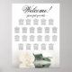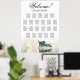 Elevate the elegance and sophistication of your wedding reception with this stunning 22 table seating chart. The modern floral design boasts a striking ivory, white, or cream coloured rose resting horizontally, elegantly reflecting in a serene pool of water. The chart accommodates up to 220 guests with a classic layout of 10 seats per table. The title is written in stylish calligraphic script, welcoming your guests and guiding them to their seats. The bottom section provides ample space for the couple's names and wedding date, adding a personal touch to your decor. This seating chart exudes romance, grace, and glamour, and is the perfect way to ensure a smooth and stylish seating arrangement for your guests.
