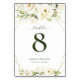 An elegant table number design featuring soft white roses and refined gold line accents —