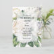 A simple, elegant wedding invitation featuring white roses and peonies and green leaves.
