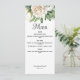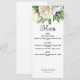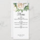 An elegant wedding menu card featuring elegant white roses and peonies.