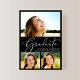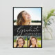 A simple and elegant black graduation announcement featuring a 3 photo collage of the grad overlayed with "Graduate" in a stylish white script, and their name, class year and school in modern white lettering.