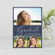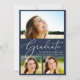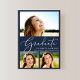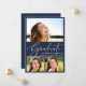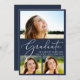 An elegant blue graduation announcement featuring a 3 photo collage of the grad overlayed with "Graduate" in a chic white script, and their name, class year and school in modern white lettering.