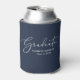 Chic blue can cooler to toast the graduate at their graduation party featuring "graduate" in an elegant white script and their name in simple white modern typography.