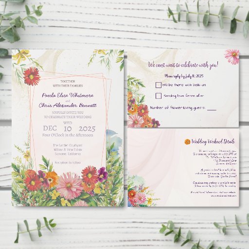Welcome your guests in style with this elegant watercolor wildflower wedding program, designed to complement a garden, vineyard, or outdoor celebration. Featuring hand-painted blooms in vivid spring colours, graceful script fonts, and a soft blush and gold dust background, this vertical layout showcases your ceremony outline and wedding party details with charm and clarity. Personalise with your names, date, location, and full event details. A perfect match to the rest of our floral stationery suite, this sign sets the tone for a romantic and nature-inspired wedding day. Display at the venue entrance or near your ceremony seating for a beautifully coordinated touch. Pair with matching RSVP cards, invitations, and enclosure cards from our collection.