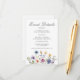 Pretty wildflowers decorate the bottom of this colorful spring wedding event details card. Watercolor floral borders are perfect for a garden ceremony outdoors while flowers are in bloom. Elegant script dances above a beautiful orange, purple, yellow, and blue botanical meadow.