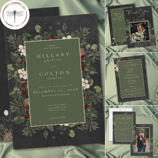 Introducing our enchanting winter wedding details enclosure card, where timeless elegance meets the beauty of the season. The rich black background, softly distressed with white accents, sets a captivating tone for your special day. In the dark sage green text area, your wedding details stand out, surrounded by a delicate cream frame that adds a touch of refinement. Embrace the spirit of winter with a breathtaking frame of lush greenery, featuring holly adorned with rich red berries, mistletoe with its delicate white berries, and the timeless allure of green pine. Created by Simply Farmhouse Press.