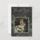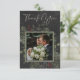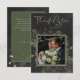 Introducing our enchanting winter wedding photo thank you card, where timeless elegance meets the beauty of the season. The rich charcoal black background, softly distressed with white accents, sets a captivating tone for your special day. In the dark sage green text area, your wedding details stand out, surrounded by a delicate cream frame that adds a touch of refinement. Embrace the spirit of winter with a breathtaking frame of lush greenery, featuring holly adorned with rich red berries, mistletoe with its delicate white berries, and the timeless allure of green pine. Created by Simply Farmhouse Press.