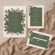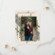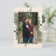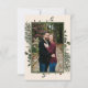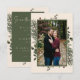 Introducing our enchanting winter wedding photo save the date card, where timeless elegance meets the beauty of the season. The rich ivory cream background, softly distressed with white accents, sets a captivating tone for your special day. In the dark sage green text area, your wedding details stand out, surrounded by a delicate cream frame that adds a touch of refinement. Embrace the spirit of winter with a breathtaking frame of lush greenery, featuring holly adorned with rich red berries, mistletoe with its delicate white berries, and the timeless allure of green pine. Created by Simply Farmhouse Press.