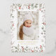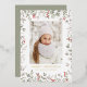 Elegant holiday card featuring your vertical photo surrounded by a border of red watercolor holly berries, eucalyptus leaves, and lush sage green foliage. Personalise the front of the botanical Christmas photo card with a custom greeting and your family name in gold foil lettering. The card reverses to display your custom message in white lettering with a dark sage background.