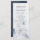 Elegant custom wedding menu card featuring a forest of grey & misty blue watercolor pine trees at the top with your name, wedding date, and menu details shown below. The menu reverses to a navy blue watercolor background with space for text and photos. Designed to coordinate with our Elegant Winter Forest wedding collection.