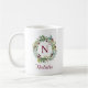 This elegant Christmas holiday seasonal coffee mug features a floral greenery watercolor wreath design framing a custom burgundy / wine red monogram initial. Personalise with your monogram initial and name in script.