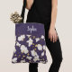 Elegant tote bag featuring a delicate golden orchids pattern on a purple background. The band on the upper part of the bag is customisable by adding your name (or other text) in a white calligraphy font.