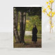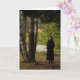 This photographic card depicts an elegant woman peering up at a birch tree. Perfect for a variety of occasions.