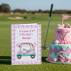 This one-of-a-kind item depicts a decorated golf cart for a women's birthday! This brightly coloured golf cart transports gifts, cake, and sparkling Champagne. This a fun 27th birthday card to give to someone who lives and breathes golf!