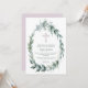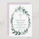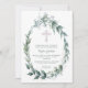 This modern baptism invitation features a pink cross and an elegant watercolor wreath of leaves and silver-grey flower buds. MATCHING items in our store.