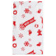 A gift bag with a red seamless repetition of Christmas elements - stockings, ginger bread man, snowflakes, reindeer, Christmas ornaments, candles, Christmas tree, and the words "Merry Xmas" - in illustration.