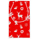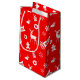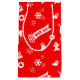 A gift bag with a white seamless repetition of Christmas elements - stockings, ginger bread man, snowflakes, reindeer, Christmas ornaments, candles, Christmas tree, and the words "Merry Xmas" - in illustration, against a red background.