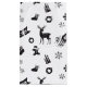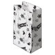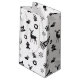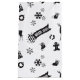 A gift bag with a black/white seamless repetition of Christmas elements - stockings, ginger bread man, snowflakes, reindeer, Christmas ornaments, candles, Christmas tree, and the words "Merry Xmas" - in illustration.