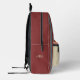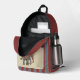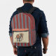 This exotic backpack design features a richly patterned elephant with a geometric pattern in tones of cream, dark red, dusty grey-blue, and soft peach. The elephant patiently guards the front pocket, with peach trim. The rest of the front feature large dark red (almost burgundy) stripes, trimmed in peach, against a grey-blue background. Your monogrammed initials appear in cream on the left, and the top and sides are trimmed in dark red. Elephants are highly revered in some cultures as symbols of patience, good luck, loyalty, and wisdom.