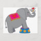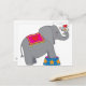A circus elephant standing on a circus tub, has a mouse with a red heart on her trunk.