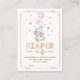 Whimsical diaper raffle insert card featuring an adorable baby elephant with heart-shaped balloons in pink and gold