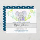 Gender Neutral themed baby shower invitations with a sweet elephant illustration hand drawn by Valarie Wade. There are light shades of both pink and blue on the elephant. This little cute elephant cradles a purple shaded heart. Multi coloured leaves in a yellow to blue gradient are on the background. Easy to adjust template allows you to customise the invitations to make them your own.