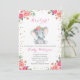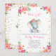 It's a girl elephant baby shower invitation with floral and gold confetti, perfect for your baby shower party.