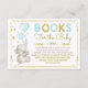 Whimsical "bring a book" invitation insert card featuring an adorable baby elephant boy with heart-shaped balloons in blue and gold