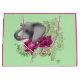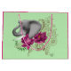 Side profile of an elephant with the trunk up. Fuchsia lotus flowers and rennin a backdrop of green