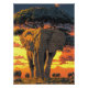 A majestic elephant stands in profile, its massive form outlined against the warm glow of a golden sunset. Its trunk curls gracefully, reaching down to gather leaves from a tall tree, while intricate details highlight the texture of its skin. In the distance, other elephants move calmly through the grasslands, their presence adding a sense of harmony to the scene. The soft, golden light of the setting sun casts long shadows across the plains, emphasising the elephant’s dignified, peaceful strength.