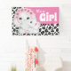 A beautiful illustration of a cute cartoon mother elephant with pink ears clutching her calf to her chest. She has beautiful pink anemone poppy watercolor flowers on her head and is hugging her baby girl to her chest. Both are framed by a pink background and black and white leopard skin print. The words, it's a girl, appears to their right.
