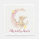 Cute elephant sitting on a crescent moon with gold stars, flowers, and glitter on a soft white texture background for a baby girl shower.