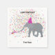 A cute illustration of an elephant partying and having fun! Elephant wearing a party hat and blowing party horn with confetti raining down on it. Let the celebrations begin! Perfect for anyone who loves funny animal illustrations. Ideal birthday party napkins. Customise the occasion and name and make it your own.