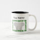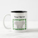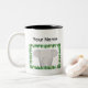 Sip your favourite morning beverage in a personalised mug. A sturdy grey elephant is placed in the "jungle" with leaves all around it. Fill in your name in the customised text boxes. Great for gifts.