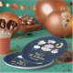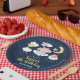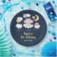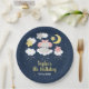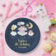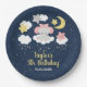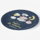 This cute and whimsical plate features an adorable baby elephant in a pink bow sitting on a cloud with falling stars. In the background is a starry night sky and crescent moon. The text combines handwritten script and sans serif fonts for a stylish and modern look. This is perfect for a birthday party.