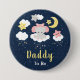 This cute and whimsical baby button can be personalized with a title such as daddy to be, grandpa to be, uncle to be. It features an adorable baby elephant in a pink bow sitting on a cloud with falling stars. In the background is a starry night sky and crescent moon. The text combines handwritten script and sans serif fonts for a stylish and modern look. This is perfect for a baby shower.