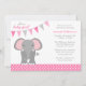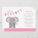 A trendy girl elephant baby shower invitation featuring a bunting banner pendant and polka dots. Shown in shades of pink and grey.