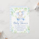 Boys elephant baby shower invitations with sweet watercolor baby elephant wearing crown on a palm leaf and blue watercolor stripe background. These adorable boy elephant baby shower invitations are easily customised for your event by simply adding your event details in the font style and wording you prefer.