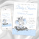 Elephant baby shower invitations with cute baby boy elephant wearing a baby blue and silver crown sitting on an elegant silver tassel pillow on a baby blue and white polka dot background. These elephant baby shower invitations are easily customised for your event by simply adding your details. You can remove the crown, and you can remove the back side background if you prefer.