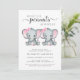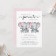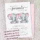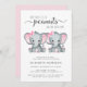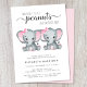 A cute twin baby girls sprinkle invitation with "Two Sweet Little Peanuts Are On Their Way" written in soft grey modern typography and a stylish script with swashes and two pastel pink watercolors of baby elephants. Personalise the mother-to-be's name and sprinkle details in simple grey typography.