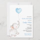 Baby Shower invitation featuring an adorable watercolor elephant holding a blue heart balloon. Personalise with your information or click "Click to customise further" to edit font styles, size and colours.