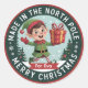 Designed as a round badge, it features a cheerful elf holding a gift against a snowy background, framed by a stitched border for a cozy, crafted look. The playful text reads: “Made in the North Pole • Merry Christmas.”