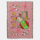 Elf Ho Ho Holiday throw blanket features a diagonal stripe white and red background with a cute elf wearing a stocking cap of red and green resting against a big Christmas tree ball surrounded by snowflakes of red and green and red and white striped candy canes. Candy cane and gold jingle bell text reads Ho Ho Ho! This fun and colourful elf design holiday throw makes a great gift or get one for yourself to enjoy for years to come!