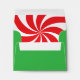 This green envelope has a simple, funny design with elf legs wearing green & white striped tights and red elf shoes, with tiny jingle bells on the front and a bright, fun, festive, red and white peppermint candy swirl on the inside.